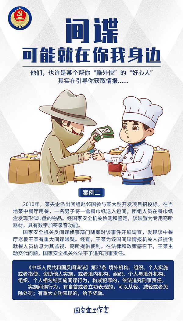 增强反奸防谍敌情意识。当前我国改革发展所面临外部形势严峻复杂,境外间谍情报机关对华开展情报渗透活动日益活跃,间谍可能就在你我身边。从所披露的案件看,他们以我党政军机关、军工企业和科研院所等核心涉密岗位人员为重点目标,通过感情拉拢、诱蚀腐化、金钱收买、提供帮助等多种手段,千方百计进行拉拢策反,同时发展运用不明真相的社会人员,搜集核心机密情报,对我国国家安全构成严重威胁。